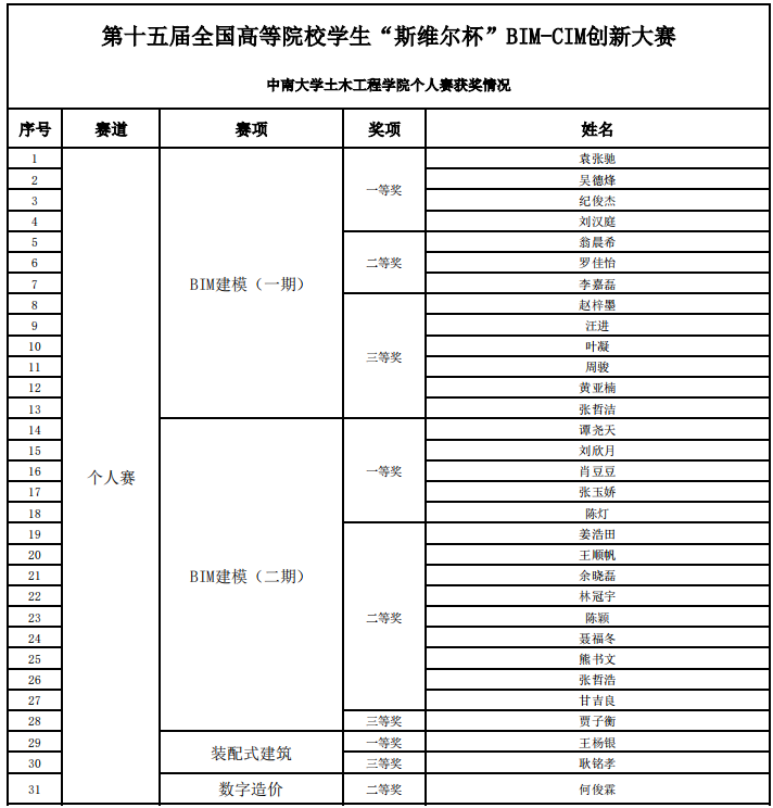 5月11-12日,第十五届全国高等院校学生“斯维尔杯”BIM-CIM创新大赛总决赛在湖南省长沙市举行,beat365英国官方网站在团队赛中斩获本科组正向一体化BIM、CIM应用赛项冠军及一等奖2项,在个人赛中共获得一等奖10项、二等奖13项、三等奖8项。