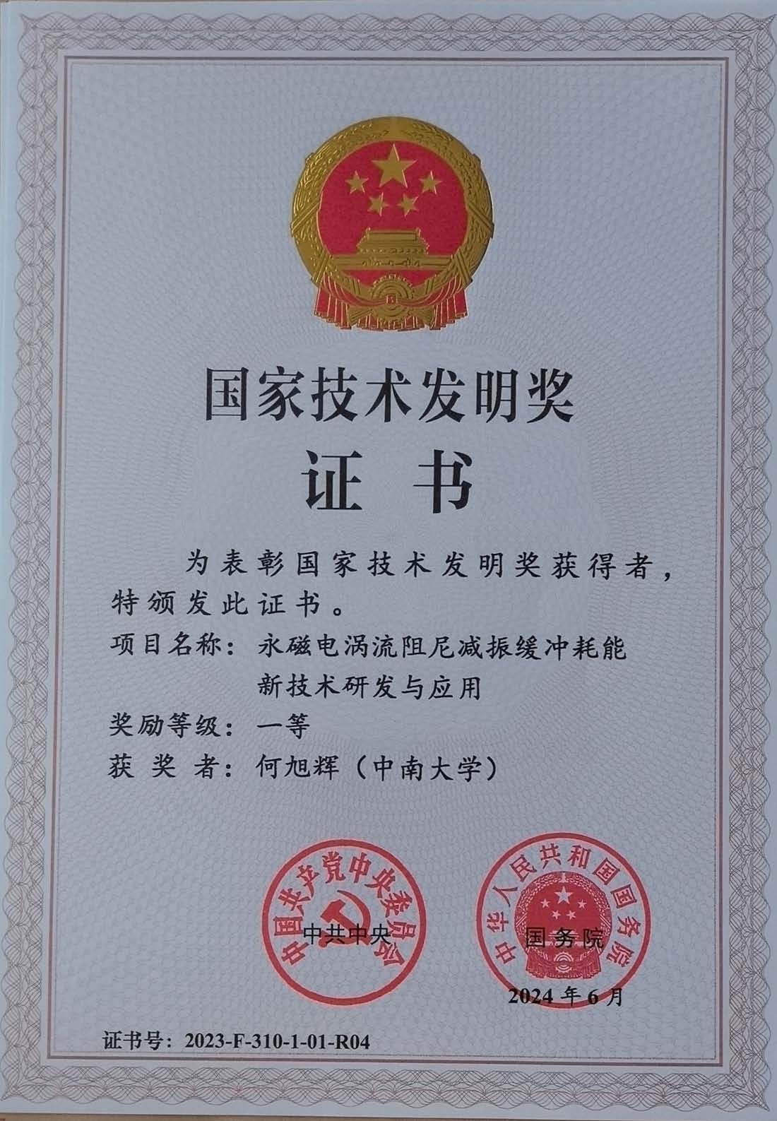 beat365官网何旭辉教授参与完成的“永磁电涡流阻尼减振缓冲耗能新技术研发与应用”项目荣获2023年度国家技术发明奖一等奖。