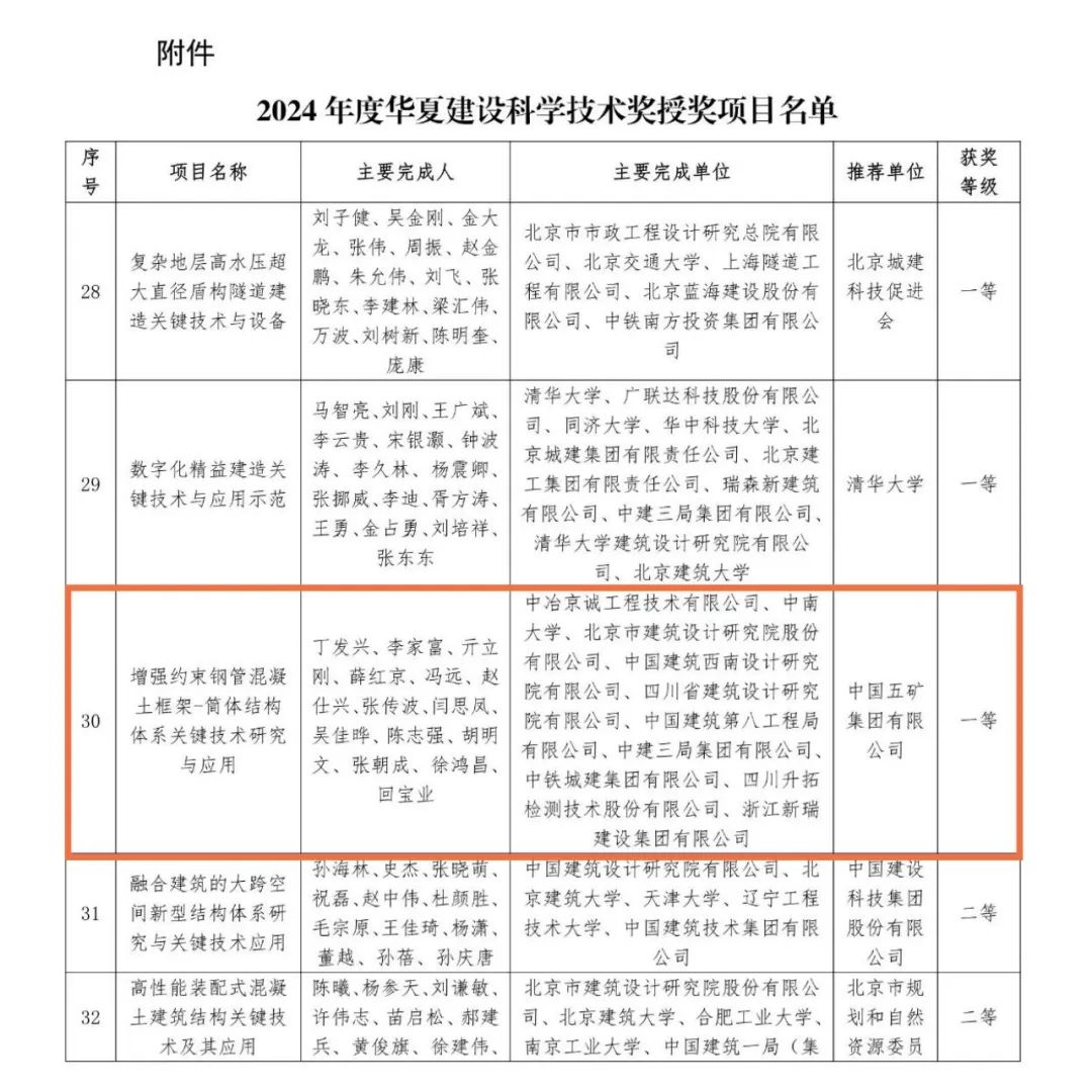 近日,华夏建设科学技术奖励委员会发布《关于发布“2024年度华夏建设科学技术奖”授奖项目的公告》(华夏奖字〔2025〕第1号),中冶京诚工程技术有限公司牵头,beat365英国官方网站参与完成的“增强约束钢管混凝土框架-筒体结构体系关键技术研究与应用”荣获一等奖,beat365官网丁发兴教授个人主持。