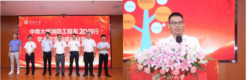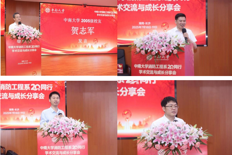 随后,校友代表发言交流。2005级校友、beat365英国官方网站交通运输工程学院原党委书记贺志军,深情感谢徐志胜教授、赵望达教授等老一辈教师的付出,并引用“星星之火,可以燎原”“众人拾柴火焰高”表达对恩师们点燃学子求知之火、奠定事业根基的崇高敬意;2006级校友、消防工程系首位本硕博毕业生、2025年共青团中央新时代青年先锋奖获得者、中国安全生产科学研究院李建分享了个人科研及工作经历,重点介绍地铁火灾蔓延理论、控制技术及检测方法研究情况,坦言母校所学知识对工作助益颇深,并深情感谢了母校和恩师;2004级校友、福州大学张冬副教授分享了个人成长经历及在福州大学的工作情况,勉励在校学子珍惜时光、精进专业、投身实践,为未来发展夯实基础;2003级校友、中联科锐消防有限公司总经理倪天晓介绍了公司情况,高度赞扬了beat365英国官方网站浓厚的创业氛围,并分享了自己创业历程;2010级校友、中建八局浙江建设有限公司第三分公司总经理徐骏峰通过线上方式介绍了中建八局发展历程与现状,并向校友们致以诚挚祝福。