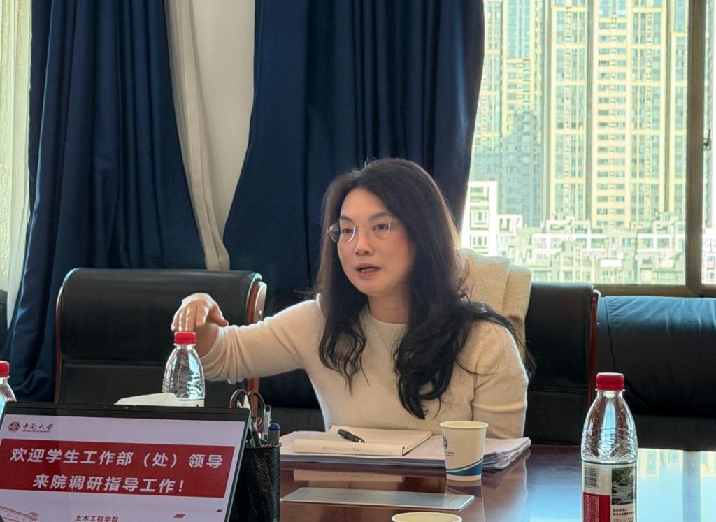 纪晓飞对徐赞主任一行的到来表示热烈欢迎,并感谢学工部长期以来对学院学生工作的关心与指导。随后,汇报了自上一轮专题调研以来学院学生工作情况。她指出,在学工部领导的大力支持下,学院学生工作始终坚持“围绕中心、服务大局、夯实基础、突出特色”的思路,不断提高日常管理精细水平,拧紧安全责任链条,切实维护学生安全稳定。同时,学院紧扣学科专业特点,把思想价值引领与解决专业思想问题紧密结合,着力塑造“一对一共成长”、“土木青年说”等育人品牌,深化校企合作集聚资源,努力为学生成长赋能提供保障,构建了具有自身学科特色的思政工作体系。她表示,学院将持续把深入践行“一线规则”作为履职尽责的“基本功”,以研究制定学院“十五五”发展规划为契机,持续深入推进新时代立德树人工程,为更好促进人才培养和“双一流”建设贡献力量。