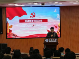 会议在全体与会党员齐声合唱《国际歌》中拉开序幕。随后,徐昊达宣读了预备党员名单。学生党员代表王金磊同志领誓,全体党员面向鲜红党旗,郑重举起右拳,庄严宣誓。