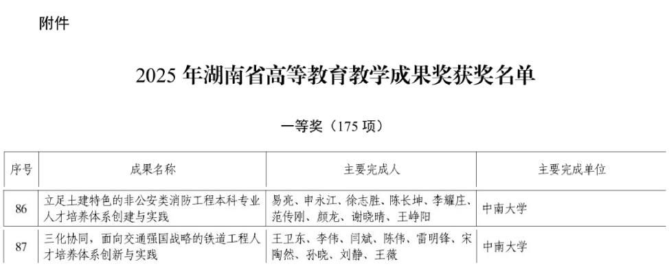 近日,湖南省教育厅公布了2025年湖南省高等教育教学成果奖获奖名单,beat365官网主持的“三化协同,面向交通强国战略的铁道工程人才培养体系创新与实践”和“立足土建特色的非公安类消防工程本科专业人才培养体系创建与实践”2项成果获得一等奖。