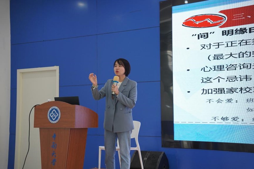 校心理中心谭鑫老师作了题为“运用‘望闻问切’四诊法,打开大学生心灵之门——面对学生心理问题班导师可以做什么”的主旨分享,她以“望闻问切”四诊法结合多个心理问题案例向与会老师分享了如何识别和解决学生心理问题,她提出要从学生的角度出发,多渠道分析学生出现心理问题的症结,从而达到解决根本问题的效果。