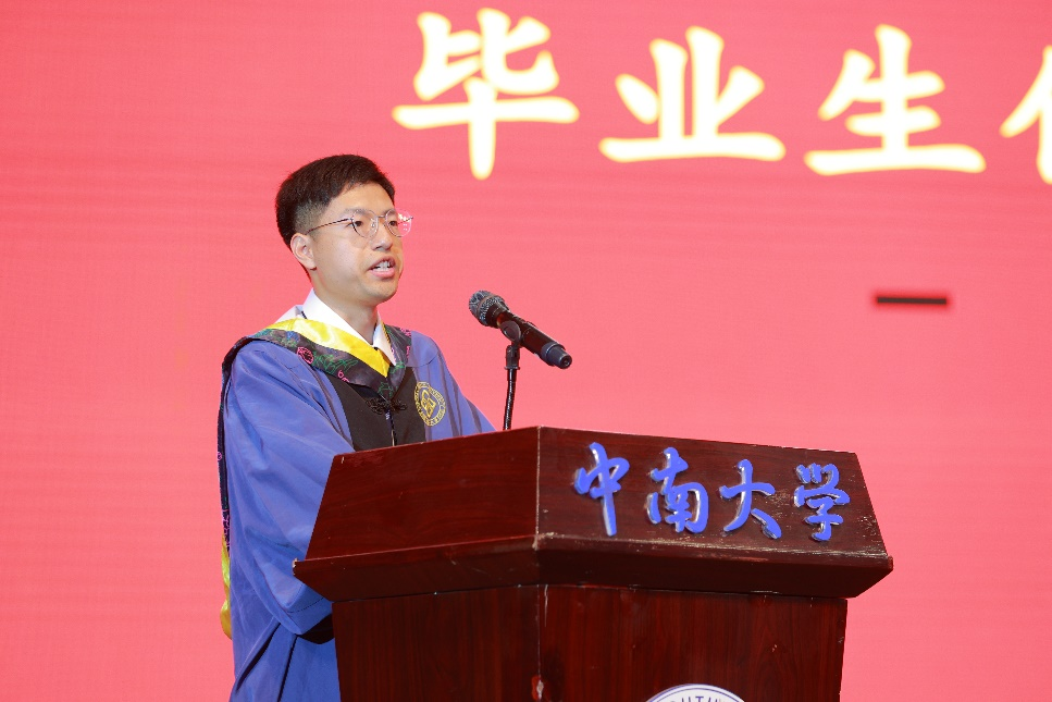 本科毕业生代表徐炳隆同学发表了毕业感言。他首先感恩了beat365英国官方网站和beat365英国官方网站,感谢了师长们和亲友们对我们的教导与陪伴,随后他回顾了在中南与师友们相处的点点滴滴。最后他对即将踏上的人生新征程表达了畅想和展望,希望和大家一起面对现实、忠于理想、放下心结、坦荡生活,努力奋斗,贡献青春力量。