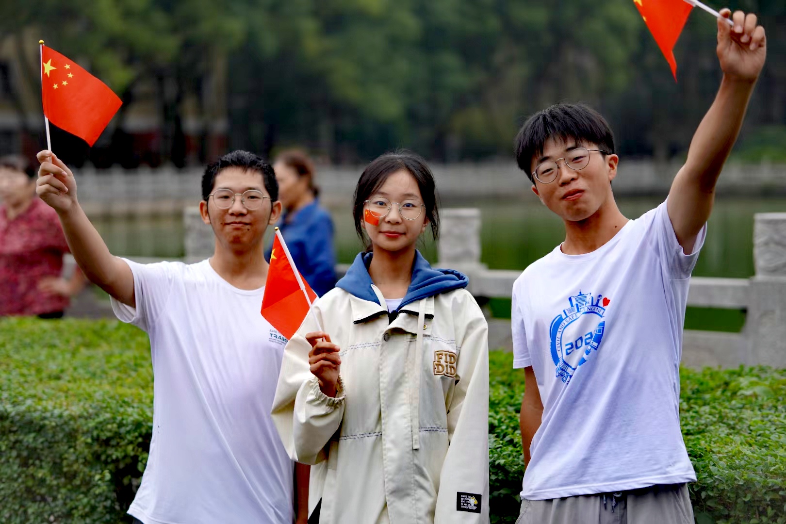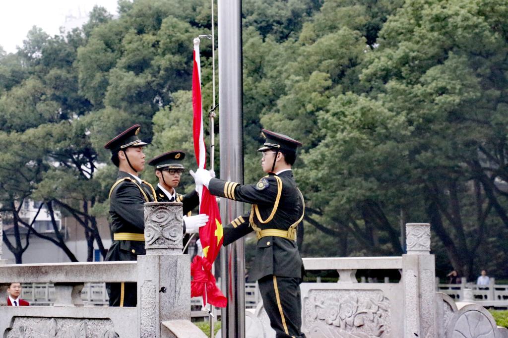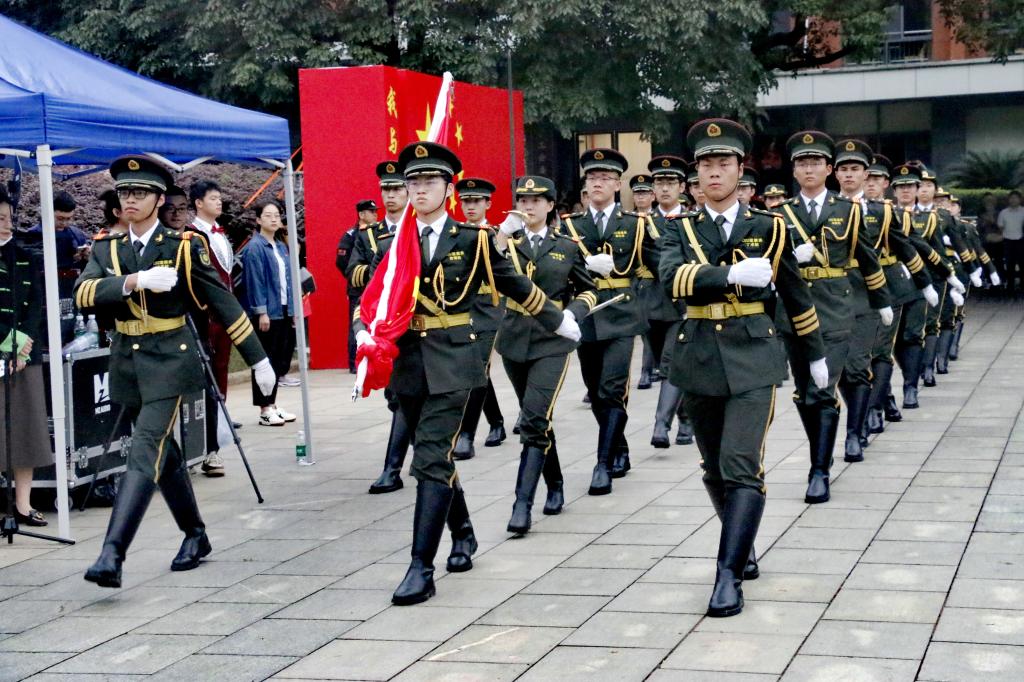 秋风送爽,旭日初升,清晨7:00,升旗仪式正式开始。国旗班仪仗队员身着挺阔军装,戴穗执枪,迈着整齐有力的正步行至旗杆前。随着《义勇军进行曲》庄严奏响,擎旗手振臂将旗帜高高抛出,鲜艳的五星红旗在熹微晨光中冉冉升起,全体师生行注目礼,齐唱国歌。beat365英国官方网站全体同学统一穿上文化衫,以饱满的精神面貌与澎拜的爱国热情为祖国送上衷心祝福,以“知行合一,经世致用”的校训为学校发展做出自己的贡献。两鬓斑白的老党员眼眶中饱含着骄傲的泪水,脸庞青涩的新同学扬起了自信飞扬的微笑,观此胜景,壮怀激荡,每一位师生都在此刻抒发着对祖国富强、民族进步的美好愿景。