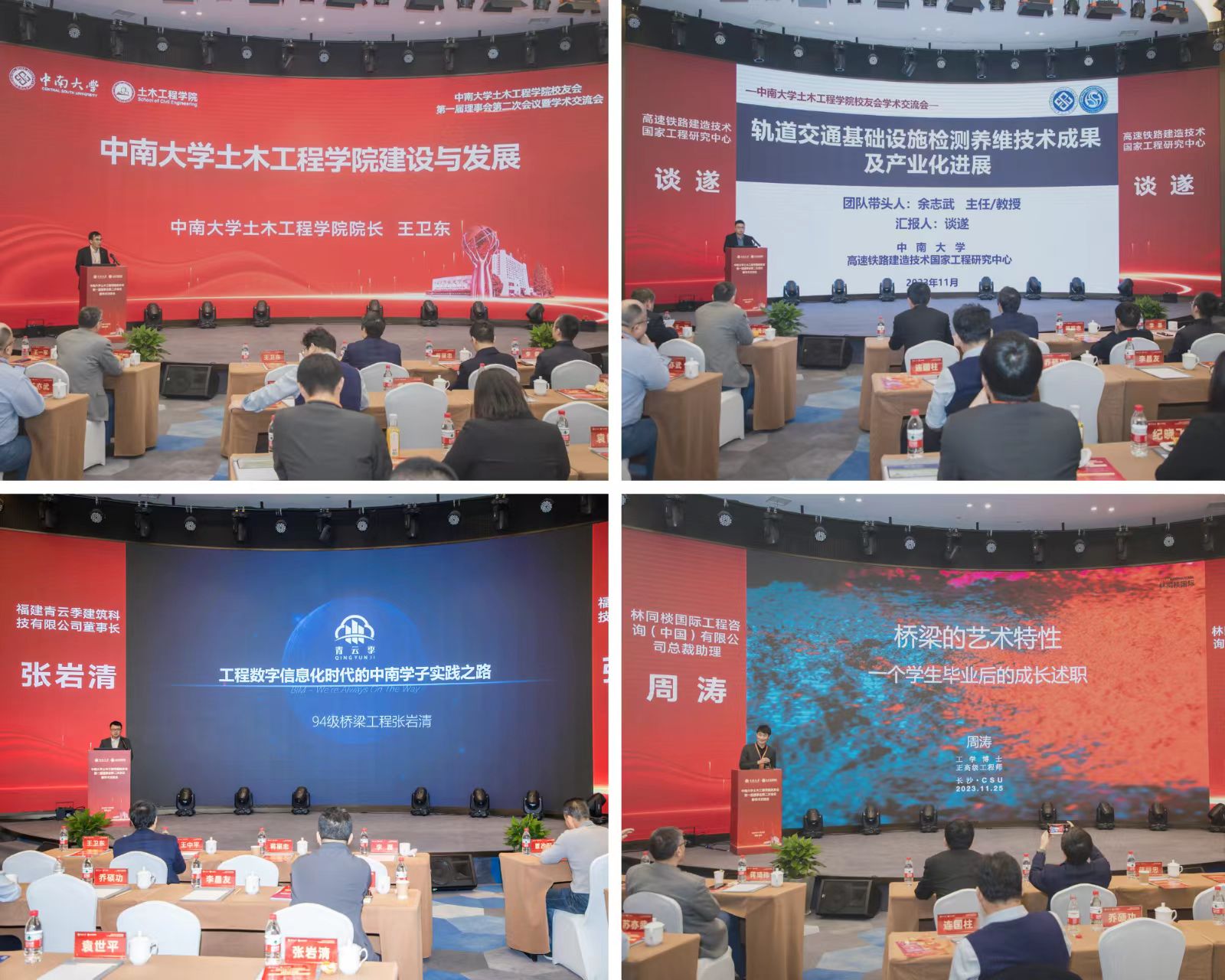 学术交流环节由学院副院长雷明锋主持。王卫东做了题为《beat365英国官方网站建设与发展》的报告,讲述了中南土木学科孕育渊源,艰苦创业,乘势而为、稳步推进的成长历程,多角度全方位体现了beat365英国官方网站在人才培养与科技创新方面的成就。学院教师谈遂做了题为《轨道交通基础设施检测养维技术成果及产业化进展》的报告,简明清晰地向大家介绍了beat365官网在智能监检测、评定与养维的基础理论、共性技术、关键装备方面取得的成就。福建青云季建筑科技有限公司董事长、1994级桥梁工程校友张岩清做了题为《工程数字信息化时代的中南学子实践之路》的报告,以自身成长经历为切入点,强调了数字化建模领域与新时代工程产业的紧密联系。林同棪国际工程咨询(中国)有限公司总裁助理2000级土木工程专业校友周涛做了《桥梁的艺术特性——一个土木学生毕业后的成长感悟》主题报告,将理性的工科与感性的艺术相结合,生动具体地描绘了一名桥梁工程师眼中的土木之美。