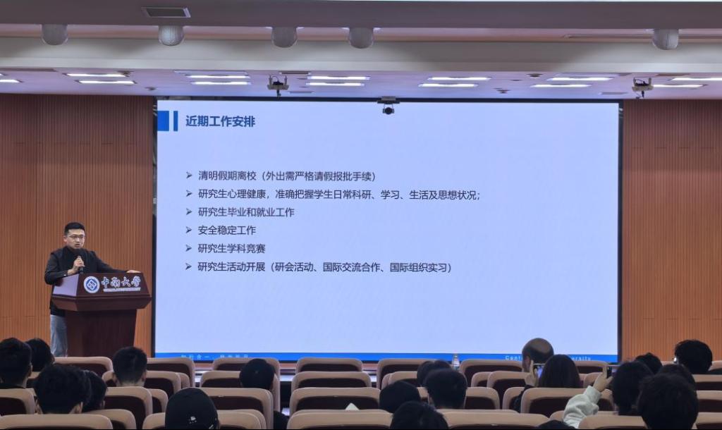 辅导员杨涛老师针对研究生近期重点任务做好工作部署,他强调要进一步加强日常事务管理,规范完善外出请假销假手续审批流程,常态化做好安全教育,谨防各类电信诈骗;要定期关注自身和他人心理健康,积极参与学校学院组织的各类文体活动,增强心理健康韧性与危机识别干预能力;要扎实用心学习,依照流程步骤推进好毕业和就业相关工作。