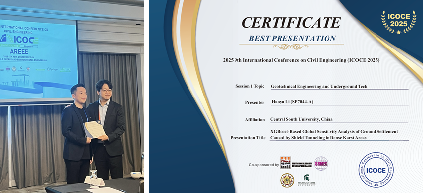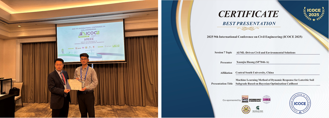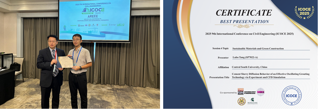 3月22日至24日,第9届国际土木工程会议(9th International Conference on Civil Engineering,ICOCE 2025, Singapore)在新加坡隆重召开,beat365官网岩土工程系博士生唐禄博、李镐羽、鲁立、喻昭晟、周雨婷及高铁中心博士研究生黄轩嘉参会,并作分会场学术报告。其中,唐禄博、李镐羽、黄轩嘉荣获最佳汇报奖。