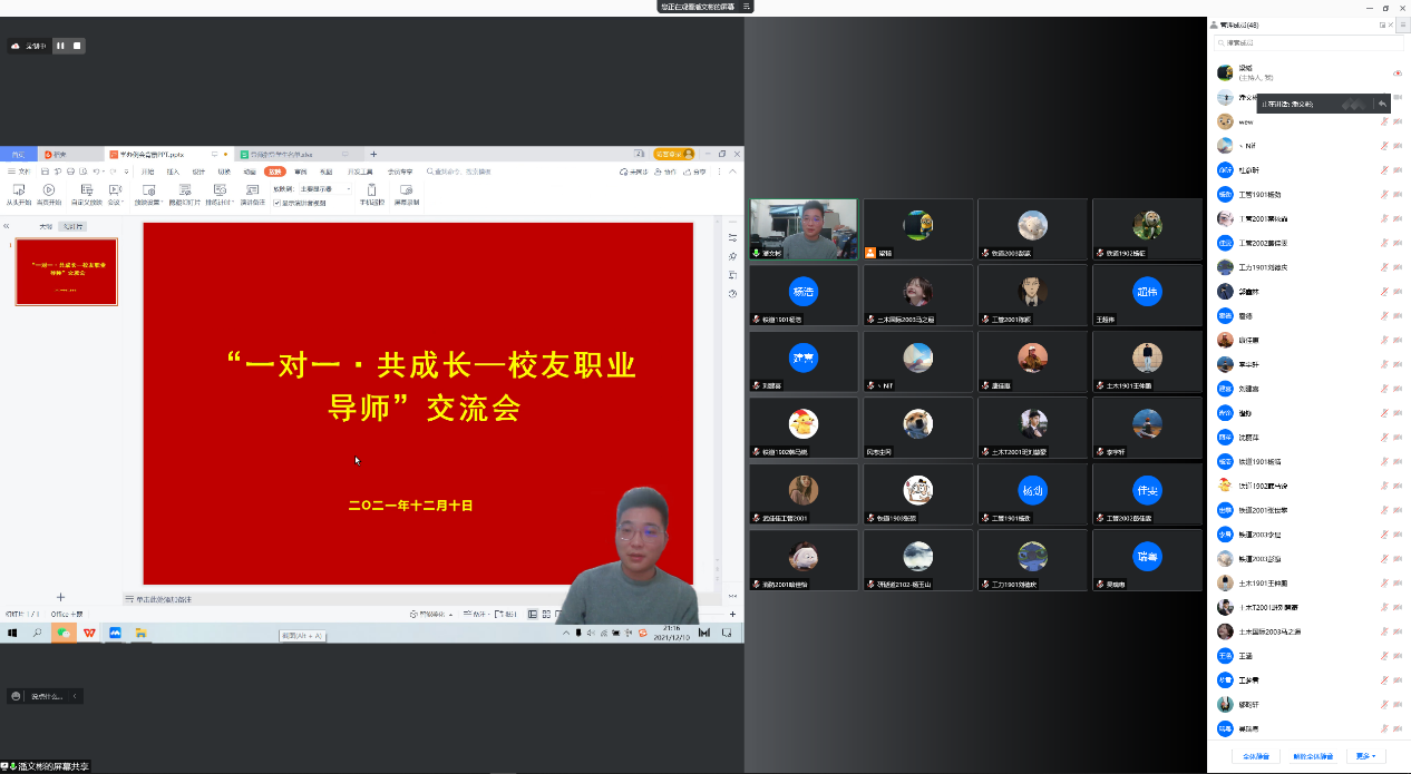 12月10日晚9点,由学院团委副书记潘文彬老师主持开展线上会议,为学生介绍了此次校友职业导师计划的工作安排及相关事项。本次活动从多家优质单位中择优选择了16位校友职业导师,通过beat365英国官方网站研究生会发放报名通知,并为报名的46名同学按照志愿匹配了合适的导师。