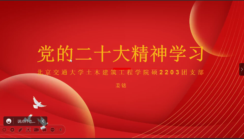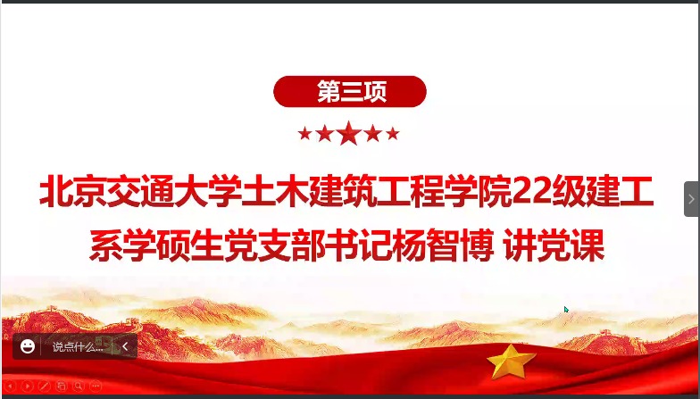 2022年11月3日19:30,beat365英国官方网站研铁道第一、二党支部和北京交通大学土木建筑工程学院22级建工系学硕生党支部等三个党支部关于党的二十大精神共建党课学习在线上如期举行。