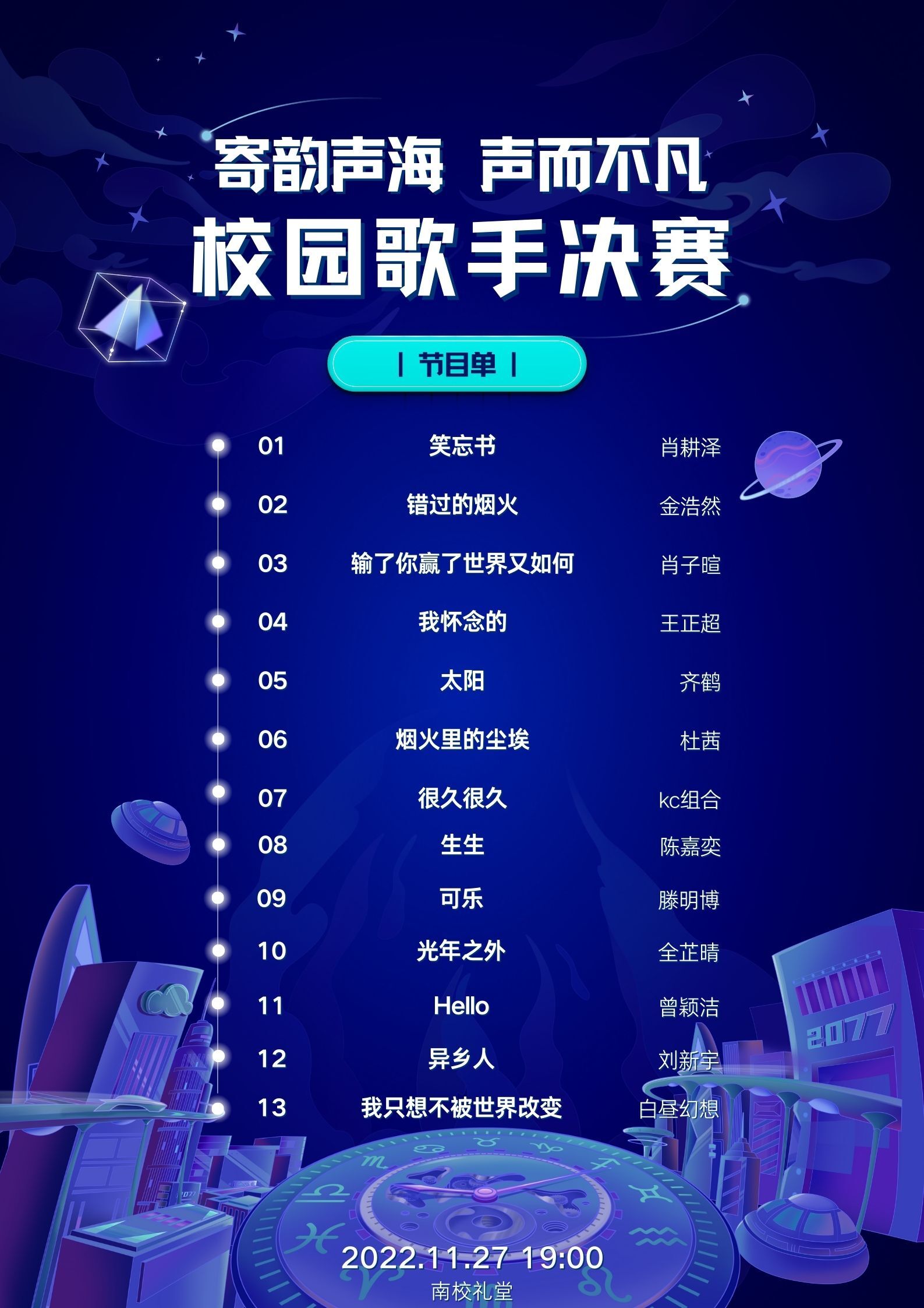 2022年11月27日晚上7点,由共青团beat365英国官方网站委员会主办,beat365英国官方网站学生会、研究生会协办的“寄韵音海,‘声’而不凡”十佳歌手决赛在线上举行。为响应疫情防控政策,观众通过线上直播观看比赛。本次比赛共有11名选手及2个组合进入决赛,由刘奕均、田雨鑫、钟可、张绍伦主持。