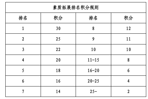 若有两支及以上(n 支)队伍单项排名相同,积同分,排名在其之后的队伍顺延 n-1 名积分。根据各队五个项目的总积分从高到低排名。