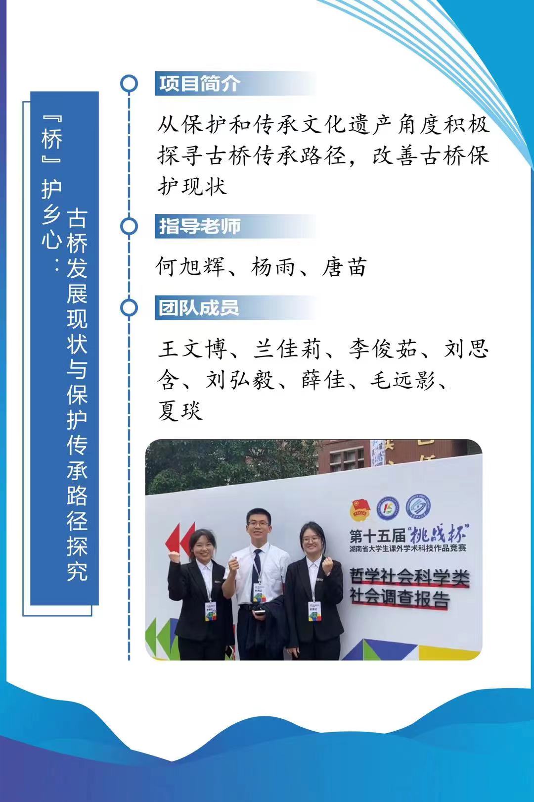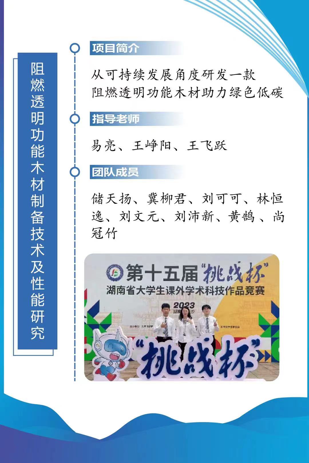 科技报国,青春启航。《“桥”护乡心:古桥发展现状和保护传承路径研究——基于13省24市(县)111座古桥的调查》团队以古桥的保护与传承为中心,立足湖南、辐射全国,面向以隆回县石杨桥和龙津风雨桥为代表的石桥和风雨廊桥群等古桥开展线下调研,实地走访13省24市(县),调查了111座古桥,跋涉近70000公里,深入探究古桥现存的问题,以新工科赋能新文科,以学科交叉助力乡村振兴。《阻燃透明功能木材制备技术及性能研究》团队则以天然可再生,绿色低碳的木材为基材,成功制备出一种集优异光学性能,优越阻燃性能和高力学强度一体的阻燃透明功能木材。