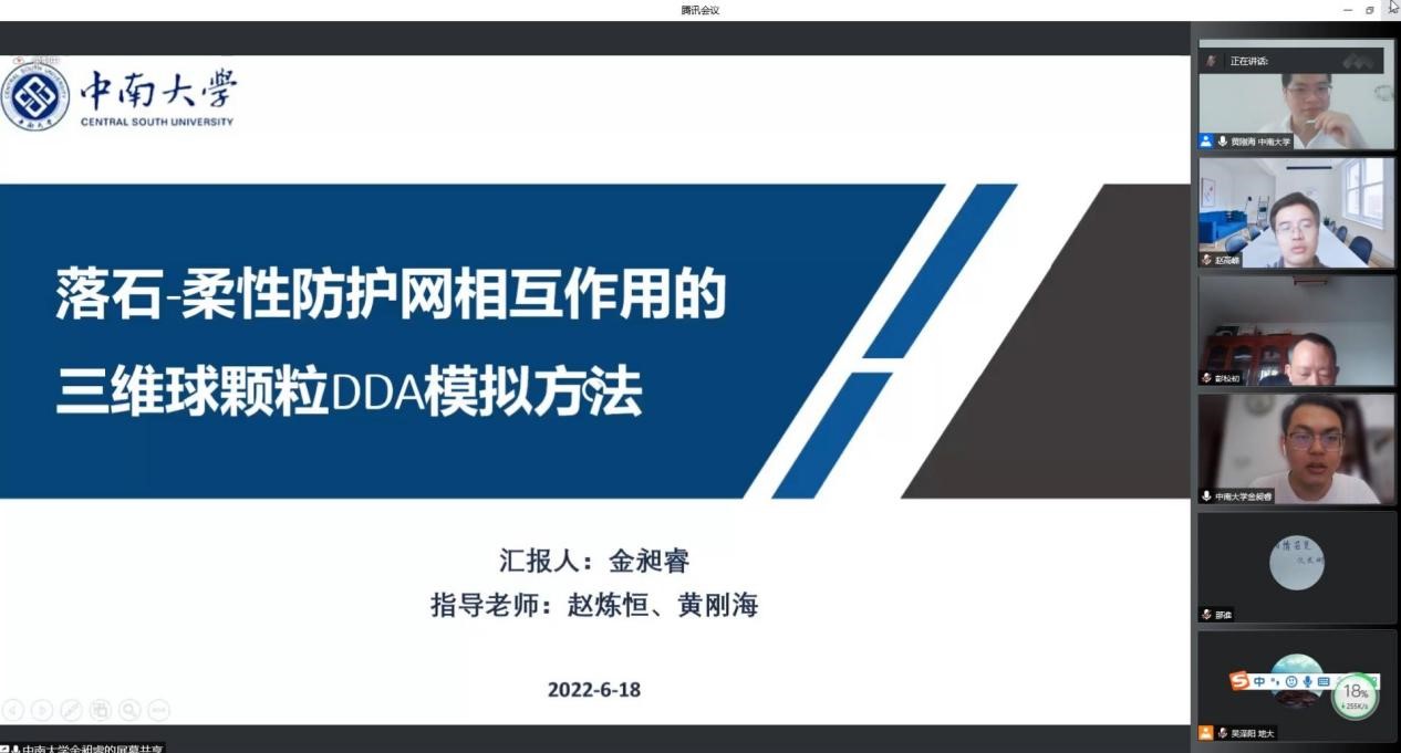 beat365官网博士生金昶睿作题为《落石-柔性防护网相互作用的三维球颗粒DDA模拟方法》的报告