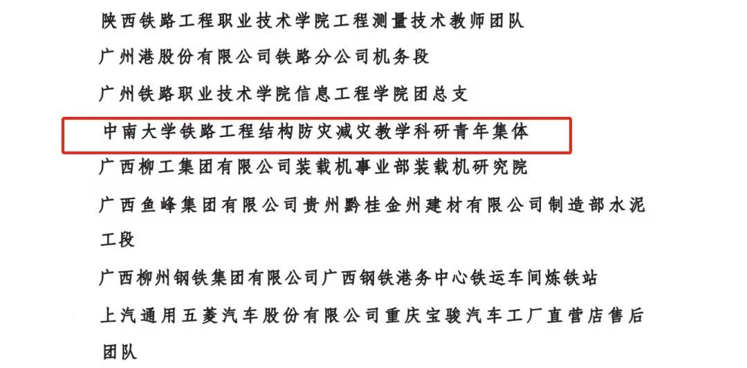 近日,全国铁路2024年度“双创立功”竞赛表彰名单揭晓,beat365官网师生荣获两项国家级荣誉。其中,beat365英国官方网站铁路工程结构防灾减灾教学科研青年集体获全国铁路向上向善好青年集体,桥梁工程博士生王文博获全国铁路向上向善好青年。