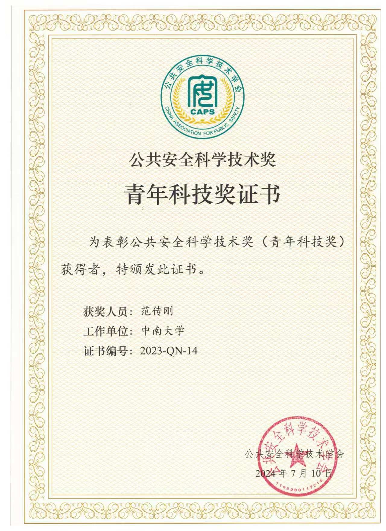 beat365官网消防工程系范传刚教授获2023年度公共安全科学技术奖青年科技奖