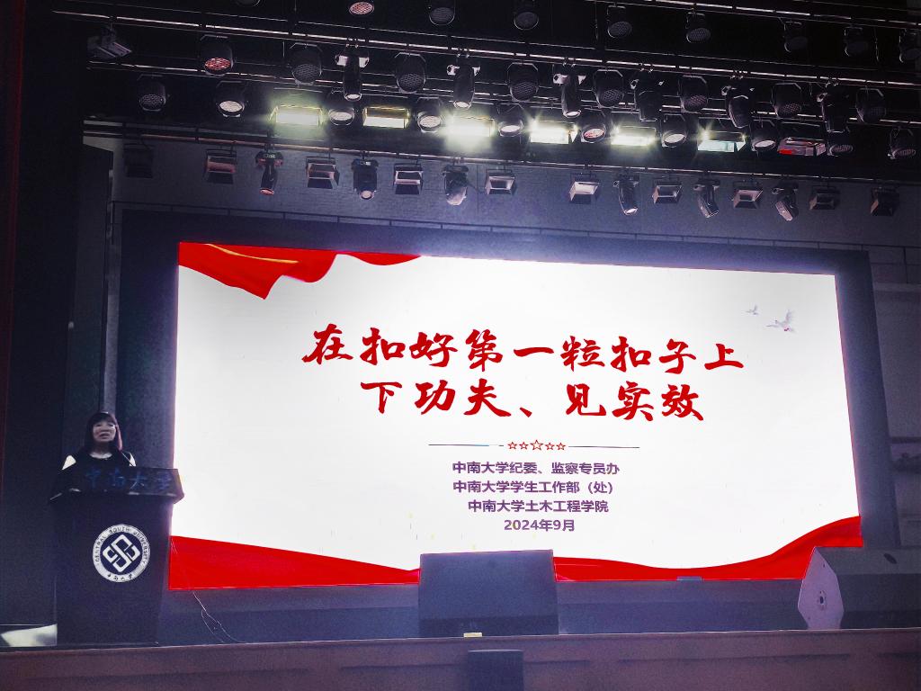 学院党委副书记纪晓飞以《在扣好第一粒扣子上下功夫、见实效》为题作“一个不能少”2024级新生廉洁教育宣讲。她从坚定理想信念,扣正“第一粒扣子”、严守纪律规矩,扣牢“第一粒扣子”、用于担当奋斗,扣好“第一粒扣子”三个方面进行讲述。她强调,全体研究生务必严守纪律规矩,勇于担当奋斗,扣正扣牢扣好“第一粒扣子”,以广大优秀中南校友为榜样,融入beat365英国官方网站,实现人生理想。