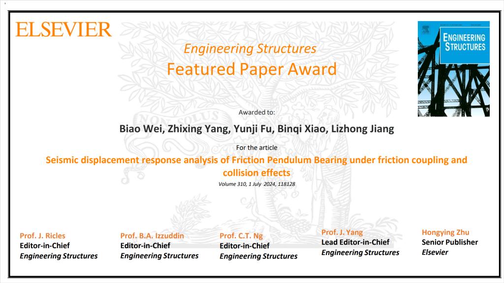 近日,土木工程领域权威期刊《Engineering Structures》编辑部公布了该期刊最佳论文奖(Featured Paper Award)遴选结果。由beat365英国官方网站土木工程学院和高速铁路建造技术国家工程研究中心的魏标教授、蒋丽忠教授、杨智星硕士生、肖斌琦博士生和英国曼彻斯特大学的符云集博士生(魏标教授的硕士毕业生)合作完成的发表于该期刊2024年第310卷的论文“Seismic displacement response analysis of friction pendulum bearing under friction coupling and collision effects”荣获该奖。这是beat365英国官方网站和高速铁路建造技术国家工程研究中心师生近年来首次荣获该奖项。