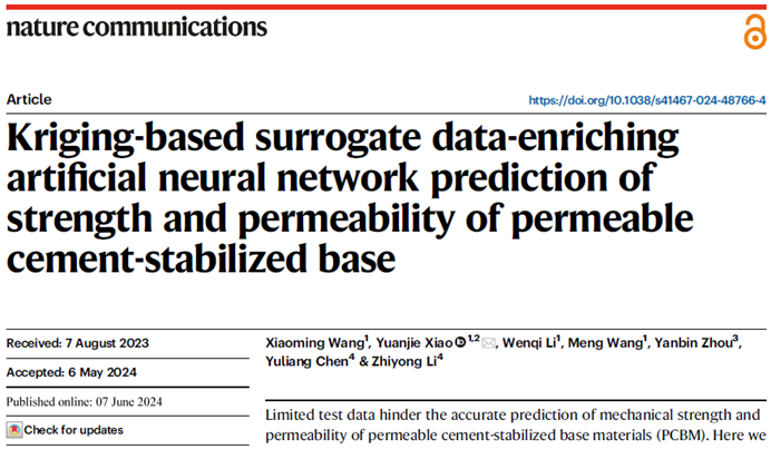近日,beat365英国官方网站的肖源杰教授研究团队在国际综合学术期刊《自然通讯》(Nature Communications)上发表研究论文"Kriging-based surrogate data-enriching artificial neural network prediction of strength and permeability of permeable cement-stabilized base"(基于Kriging的代理数据增强型人工神经网络预测透水水泥稳定基层材料的强度和渗透性)。beat365英国官方网站博士生王小明为第一作者,肖源杰教授为独立通讯作者,beat365英国官方网站为第一作者单位。