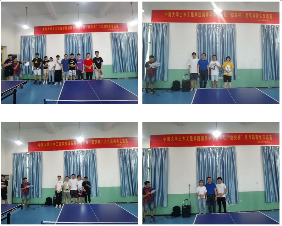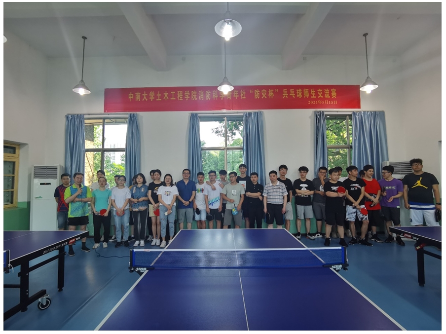2021年5月15日上午9:00,beat365英国官方网站消防工程系第八届“防灾杯”乒乓球师生交流赛于beat365英国官方网站工会铁道教职工活动中心拉开序幕。为加强师生专业交流,丰富师生课余生活,在我国第13个防灾减灾日到来之际,消防科学青年社组织策划并主办了本届乒乓球师生交流赛。比赛活动得到beat365英国官方网站的大力支持。参加本届乒乓球大赛的有beat365英国官方网站副院长易亮老师,消防工程系赵望达、申永江、王飞跃老师,beat365英国官方网站辅导员、研防灾党支部书记杨涛老师,以及beat365英国官方网站工会委员梁杨勇老师。参加学生包括消防工程系部分本科生、硕士研究生以及博士研究生。比赛项目包括男子单打、女子单打、男女混双以及颠球接力(趣味比赛)。
