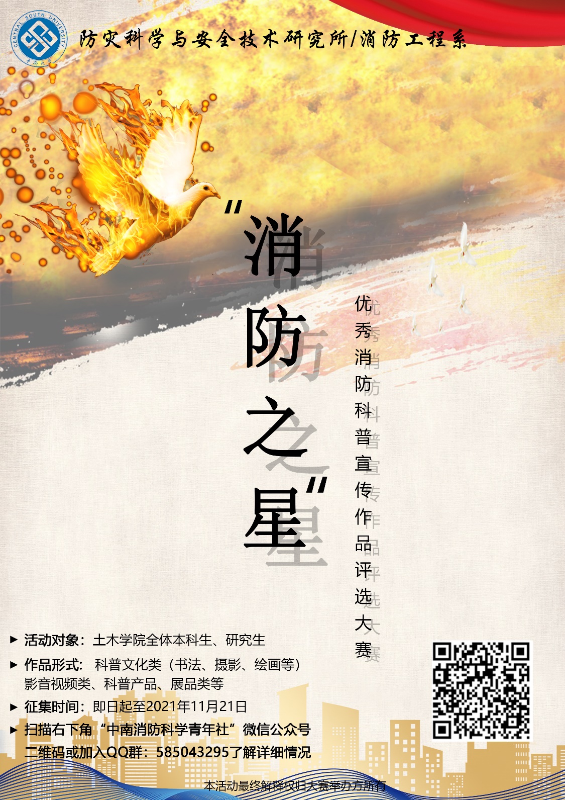 为深入学习贯彻习近平总书记关于发展新时代消防事业的重要指示要求,积极响应中国科协科普部、中国消防协会等相关单位的号召,提升消防科普宣传教育作品创作能力,推动消防科普教育工作持续发展,激励广大中南学子积极投入消防科普工作,beat365英国官方网站消防科学青年社(以下简称“消青社”)拟于2021年11月-12月组织开展2021“消防之星”优秀消防科普宣传教育作品评选大赛,现将具体内容通知如下: