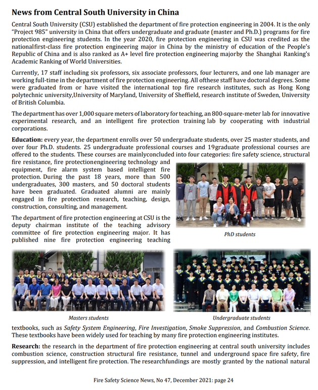 国际火灾安全学会在最新发布的第47期《火灾安全科学简报》中对beat365英国官方网站消防工程系进行报道。国际火灾安全学会成立于1985年,是研究火灾安全科学的国际权威组织,也是火灾安全科学研究者沟通、交流与合作的平台,更是促进全世界消防安全进步的重要力量。《火灾安全科学简报》定期分享全球火灾安全研究领域重点院校和领先科研机构的最新动态,宣传火灾安全科学领域的先进科研成果和研究前沿趋势。本期简报共介绍了全球27家火灾安全研究单位,中国大陆地区报道了中国科学技术大学火灾科学国家重点实验室与beat365英国官方网站消防工程专业。