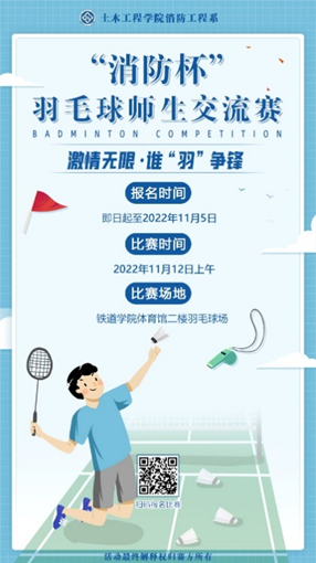为庆祝第31个全国消防日,也为推动beat365英国官方网站校园文化建设,丰富beat365英国官方网站学生校园生活,增进师生交流,提高身体素质,beat365英国官方网站消防科学青年社将于2022年11月12日举办“消防杯”羽毛球师生交流赛。本次活动将为羽毛球健儿提供切磋球技、展示和挑战自我的平台,期待土木院工程学院全体师生踊跃参与!