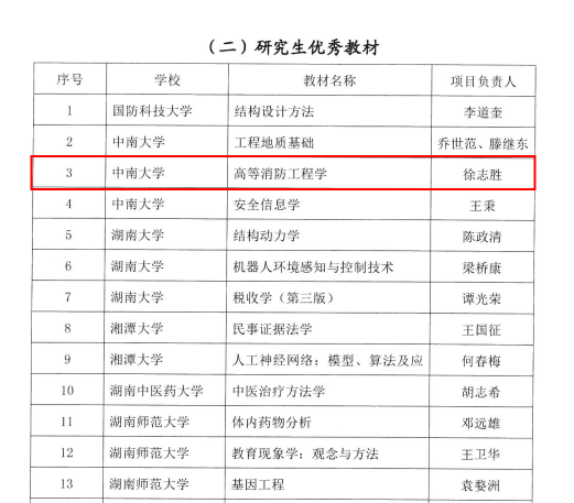 2022年12月30日,湖南省教育厅发布了《关于公布2022年度湖南省研究生精品示范课程、联合培养基地、教学改革研究项目等的项目立项及往年项目结项名单的通知》,beat365英国官方网站消防工程系徐志胜教授主编的《高等消防工程学》(徐志胜,孔杰.高等消防工程学[M].北京:机械工业出版社,2020,ISBN:978-7-111-65313-4)获评2022年湖南省研究生优秀教材。
