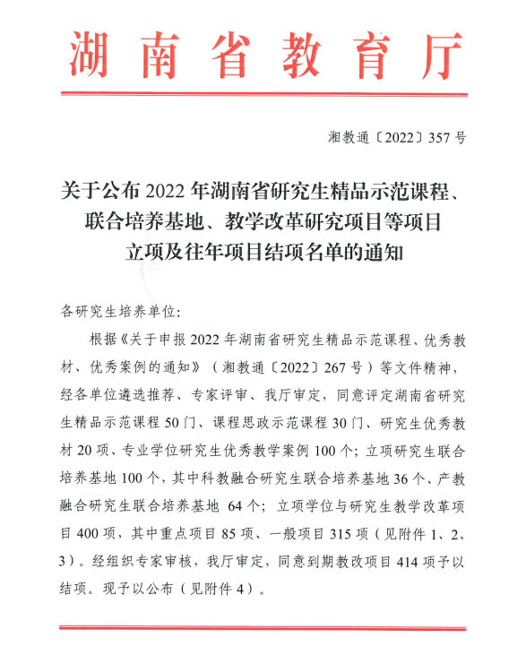 本次评选活动由湖南省教育厅主办,旨在紧密对接服务“三高四新”战略定位和使命任务,加快推进湖南省研究生课程建设,提高课程质量,打造一流人才方阵,着力提升研究生教育质量和高层次人才培养水平。经过各单位遴选推荐、专家评审、湖南省教育厅审定,共评定研究生优秀教材20项。入选教材满足社会主义现代化建设对高层次专门人才的要求,适应研究生教学与学习方式的不同特点,符合研究生培养方案和培养目标,有广泛的适用性和较强的通用性,具有较好的社会效益和应用前景。