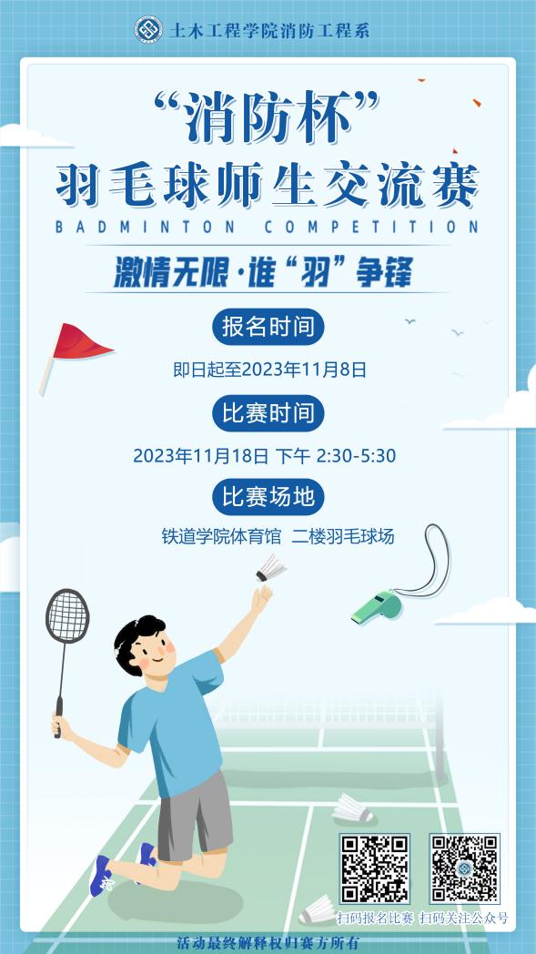 “消防杯”羽毛球师生交流赛是一项由beat365英国官方网站消防科学青年社举办的年度羽毛球赛事,旨在庆祝第32个全国消防日,推动beat365英国官方网站消防安全文化建设,营造浓厚的消防宣传氛围,并为羽毛球爱好者提供一个展示技能、挑战自我的平台,丰富校园生活,增进师生交流,提高身体素质。期待beat365英国官方网站全体师生踊跃参与!