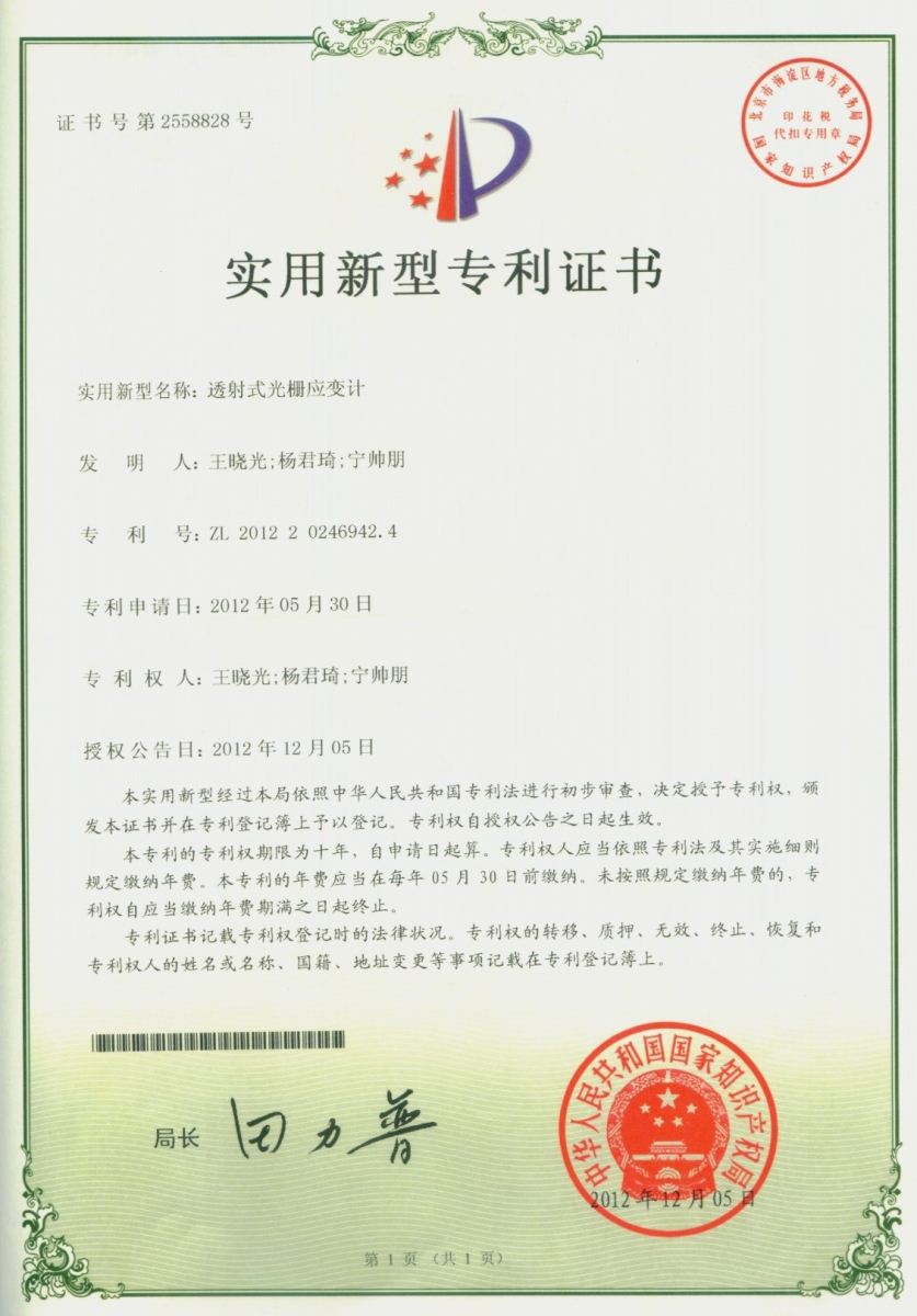 (1)授权国家专利3项:透射式光栅应变计