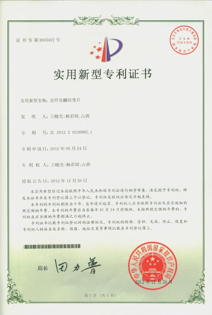 (1)授权国家专利3项:光纤光栅应变片