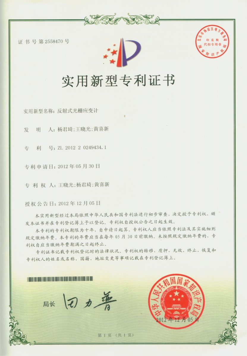 授权国家专利3项:反射式光栅应变计