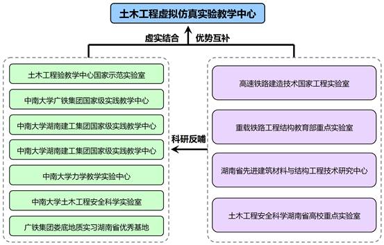 beat365官网拥有 “高速铁路建造技术国家工程研究中心”等4个科研平台和“土木工程实验教学中心国家示范实验室”等6个教学平台,为“土木工程虚拟仿真实验教学中心”的建设与发展提供了优势学科资源、优质教学团队、优良的实验条件。各平台间的组织关系如图2所示。